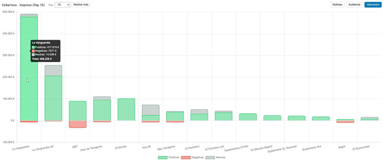 En la gráfica siguiente, que se puede generar desde la herramienta de “Panel de Análisis” de Pressclipping, podemos ver cuáles son los medios que recogen las noticias de mayor valoración económica. Este dato, resultaría útil para hacer que el Plan de Medios sea e más rentable posible. También te informa de qué región son los medios que nos dan buenos resultados, y en consecuencia, cuál es el target, sus hábitos de consumo…